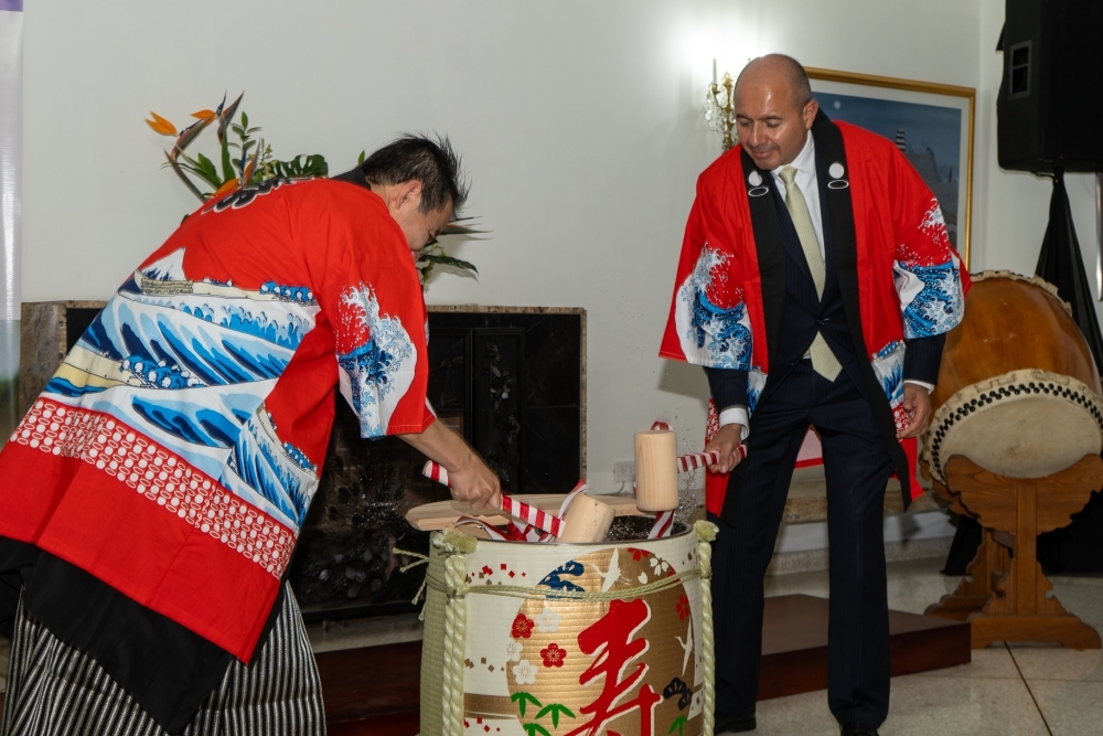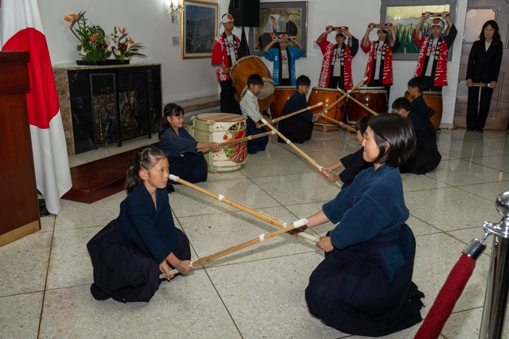 式典では、日本人学校の生徒による両国国歌斉唱及び太鼓・剣道のパフォーマンスが披露されました。また、大使の出身地広島産の日本酒による鏡割りが行われ、安藤公邸料理人の和食と共に、様々な日本酒が振る舞われました。